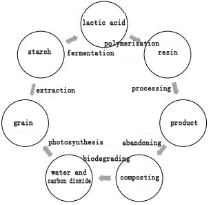 После гидролиза крахмала до глюкозы, ферментации глюкозы в молочную кислоту и полимеризация молочной кислоты, мы можем получить PLA. PLA также может быть обработан на все виды продуктов. Заброшенные продукты могут быть разлагаются до воды и углекислого газа путем переработки и компостирования, а затем поглощать зернами посредством фотосинтеза.